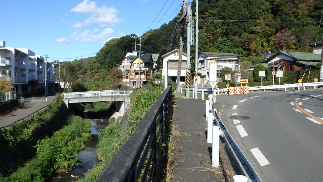 〔 18/18 〕 「坂下」バス停。左前方の白い建物は「葵の園」。バスは右上へ坂をのぼって三保町を通り抜ける。