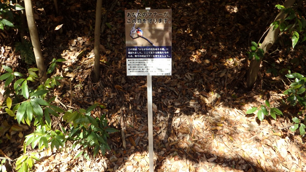 [ 11/46 ] 「この湖は『かながわ探鳥地50選』に選ばれました」。野鳥保護の案内板。
