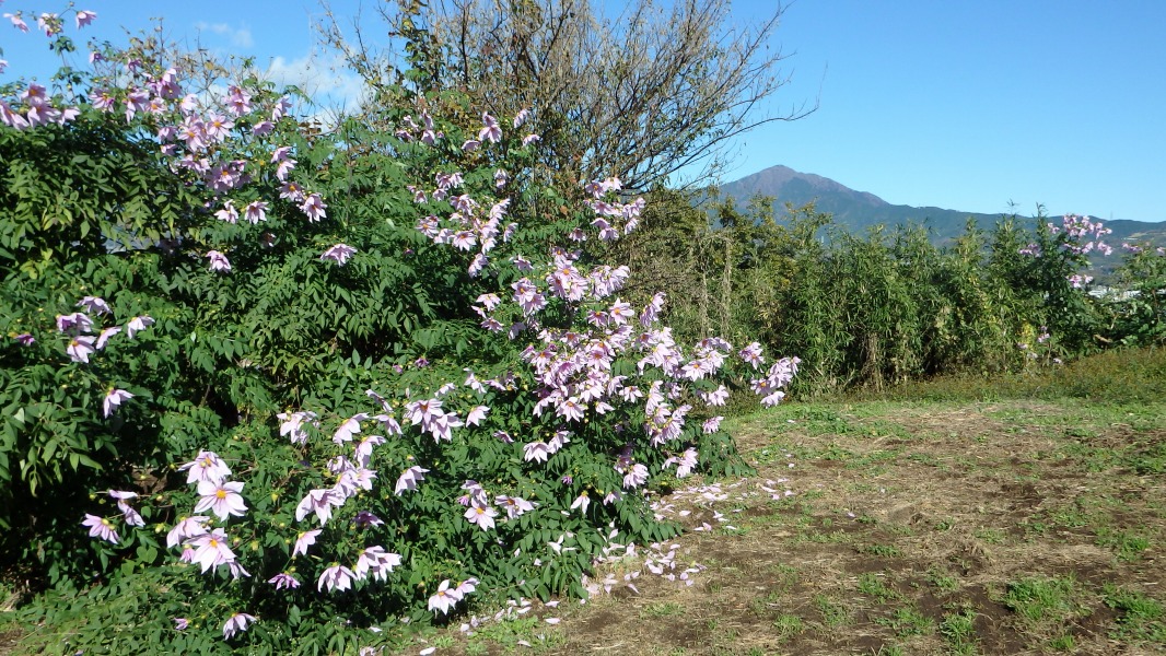 [ 3/46 ] 皇帝ダリア。キク科。背後の山は大山。