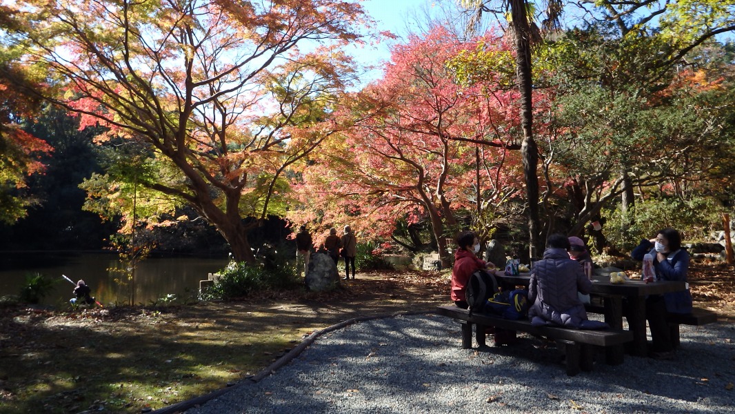 [ 34/46 ] 釣りをする人、湖を眺める人、紅葉を見ながらお弁当を囲む人