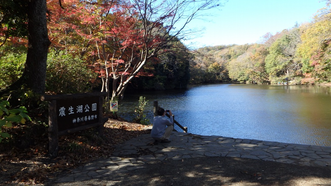 [ 10/46 ] 震生湖に到着。赤い鳥居は「秦野 福寿 弁財天社」。駐車場のトイレ前にて。