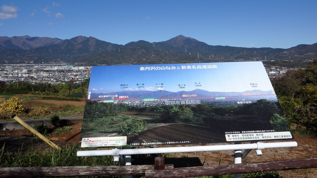 [ 36/46 ] 「表丹沢の山なみと新東名高速道路」案内板。県道62号線へ向かう道すがら。