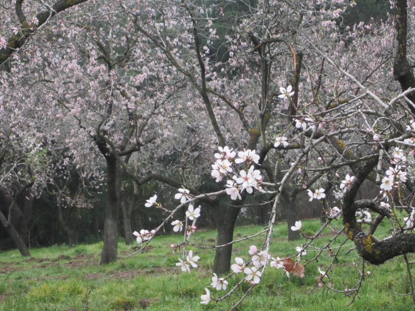 今年のアーモンドです《注》アーモンド:和名「扁桃(へんとう)」。バラ科サクラ属(モモ属/スモモ属)。サクラの花に似ているが、違いは花柄(かへい)にある。花柄とは、枝上における花の配列状態を支える茎、花を支える茎である。「 花梗(かこう) 」とも呼ばれる。アーモンドはこの花柄が短く、枝に沿うように花を咲かせるが、サクラはサクランボのようにふんわりとした長い花柄があり、1つの花芽から複数の花を咲かせる特徴がある。